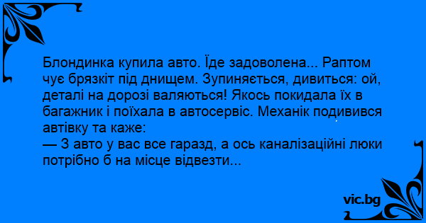 Блондинка купила авто. Їде задоволена... Раптом чує брязкіт під днищем. Зупиняється, дивиться: ой, деталі на дорозі валяються! Якось покидала їх в багажник і поїхала в автосервіс. Механік подивився автівку та каже: