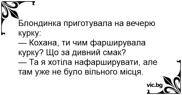 — Кохана, ти чим фарширувала курку? Що за дивний смак?