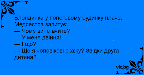 Blondīnei piedzimst dvīņi. Viņa sēž un rūgti raud. Pienāk medmāsa un prasa: Kādēļ Jūs raudat? Ko es teikšu vīram, no kā man ir otrs bērns?
