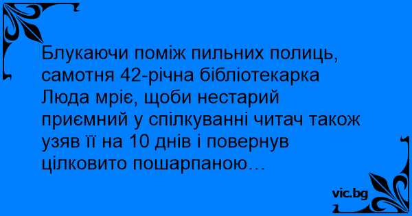 Блукаючи поміж пильних полиць, самотня 42-річна бібліотекарка Люда мріє, щоби нестарий приємний у спілкуванні читач також узяв її на 10 днів і повернув цілковито пошарпаною…