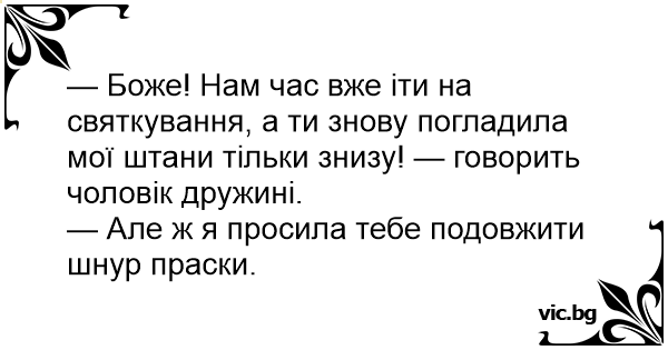 — Боже! Нам час вже іти на святкування, а ти знову погладила мої штани тільки знизу! — говорить чоловік дружині.