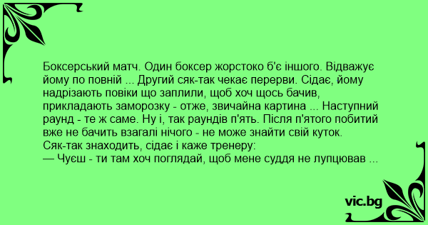 Боксерський матч. Один боксер жорстоко б'є іншого. Відважує йому по повній ... Другий сяк-так чекає перерви. Сідає, йому надрізають повіки що заплили, щоб хоч щось бачив, прикладають заморозку - отже, звичайна картина ... Наступний раунд - те ж саме. Ну і, так раундів п'ять. Після п'ятого побитий вже не бачить взагалі нічого - не може знайти свій куток.