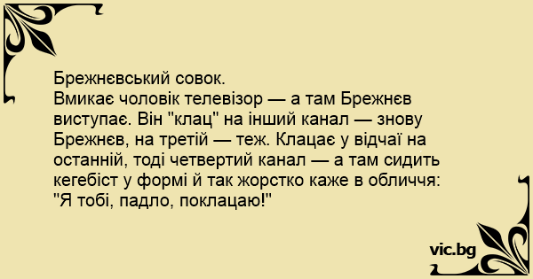 Вмикає чоловік телевізор — а там Брежнєв виступає. Він "клац" на інший канал — знову Брежнєв, на третій — теж. Клацає у відчаї на останній, тоді четвертий канал — а там сидить кегебіст у формі й так жорстко каже в обличчя: