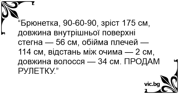 “Брюнетка, 90-60-90, зріст 175 см, довжина внутрішньої поверхні стегна — 56 см, обійма плечей — 114 см, відстань між очима — 2 см, довжина волосся — 34 см. ПРОДАМ РУЛЕТКУ.”