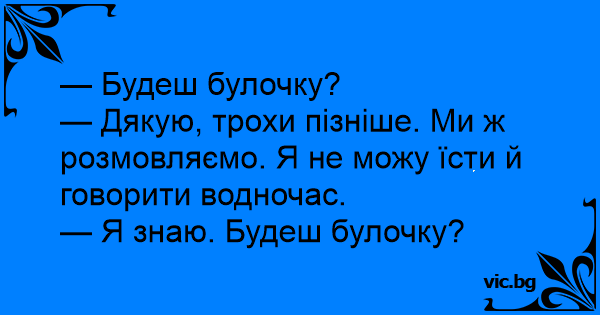 — Дякую, трохи пізніше. Ми ж розмовляємо. Я не можу їсти й говорити водночас.