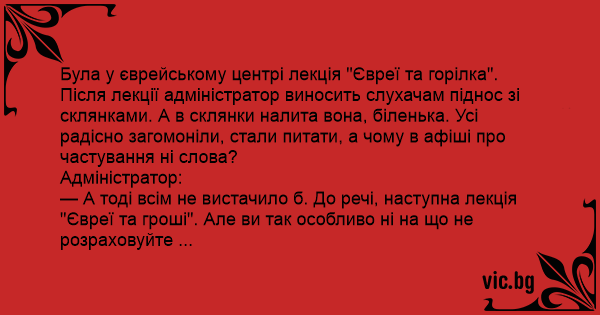 Була у єврейському центрі лекція "Євреї та горілка". Після лекції адміністратор виносить слухачам піднос зі склянками. А в склянки налита вона, біленька. Усі радісно загомоніли, стали питати, а чому в афіші про частування ні слова?