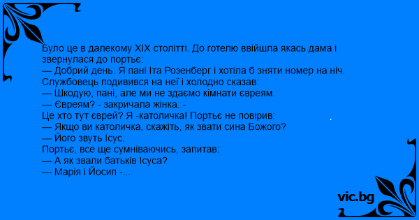 — Добрий день. Я пані Іта Розенберг і хотіла б зняти номер на ніч. Службовець подивився на неї і холодно сказав: