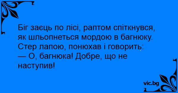 Біг заєць по лісі, раптом спіткнувся, як шльопнеться мордою в багнюку.