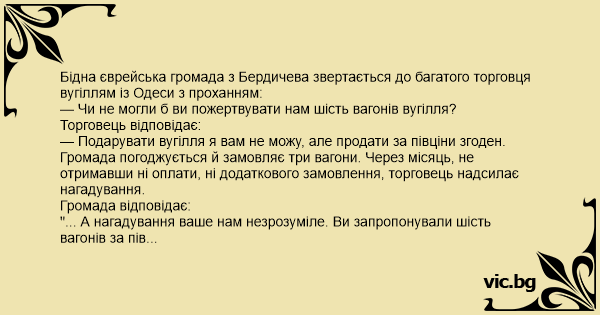 Громада погоджується й замовляє три вагони. Через місяць, не отримавши ні оплати, ні додаткового замовлення, торговець надсилає нагадування.