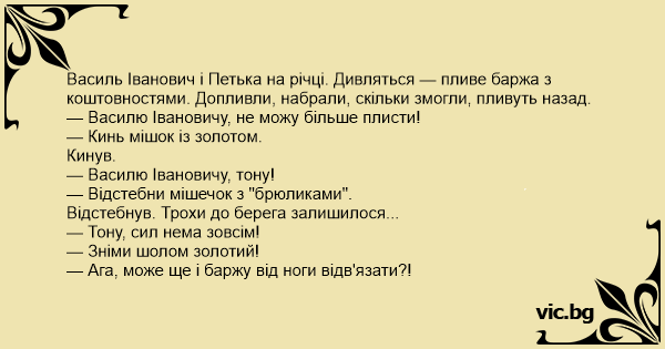 Василь Іванович і Петька на річці. Дивляться — пливе баржа з коштовностями. Допливли, набрали, скільки змогли, пливуть назад.