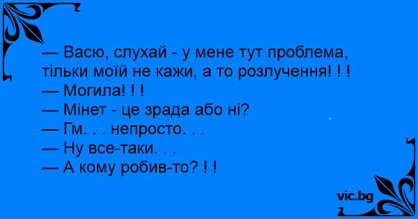 — Васю, слухай - у мене тут проблема, тільки моїй не кажи, а то розлучення! ! !