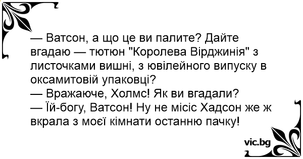 — Ватсон, а що це ви палите? Дайте вгадаю — тютюн "Королева Вірджинія" з листочками вишні, з ювілейного випуску в оксамитовій упаковці?