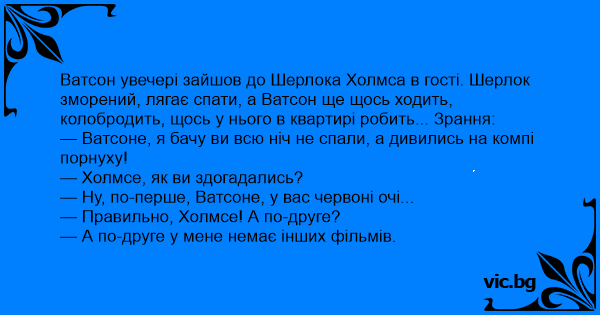 — Ватсоне, я бачу ви всю ніч не спали, а дивились на компі порнуху!