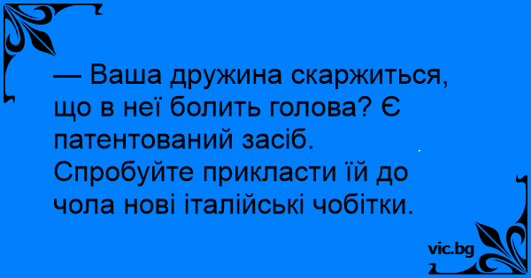 — Ваша дружина скаржиться, що в неї болить голова? Є патентований засіб.