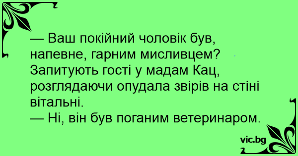 — Ваш покійний чоловік був, напевне, гарним мисливцем? Запитують гості у мадам Кац, розглядаючи опудала звірів на стіні вітальні.