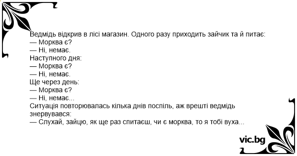 — Слухай, зайцю, як ще раз спитаєш, чи є морква, то я тобі вуха цвяхами до стіни поприбиваю!