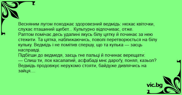 Весняним лугом походжає здоровезний ведмідь: нюхає квіточки, слухає пташиний щебет... Культурно відпочиває, отже.