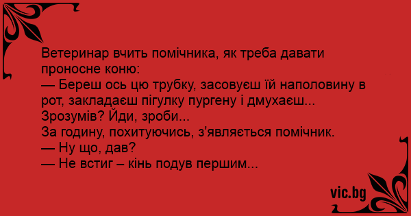 — Береш ось цю трубку, засовуєш їй наполовину в рот, закладаєш пігулку пургену і дмухаєш... Зрозумів? Йди, зроби...