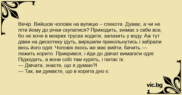 Вечір. Вийшов чоловік на вулицю – спекота. Думає, а чи не піти йому до річки скупатися? Приходить, знімає з себе все, бо не хоче в мокрих трусах ходити, залазить у воду. Аж тут дівки на дискотеку ідуть, вирішили прикольнутись і забрали весь його одяг. Чоловік якось же має вийти, бачить — лежить корито. Прикрився, і йде до дівчат вимагати одяг. Підходить, а вони собі там курять, і питає їх:
