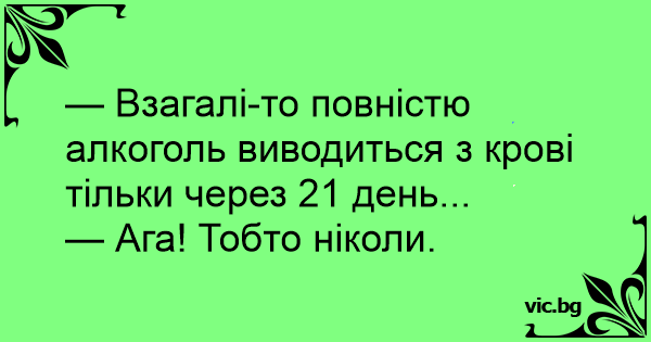 — Взагалі-то повністю алкоголь виводиться з крові тільки через 21 день...