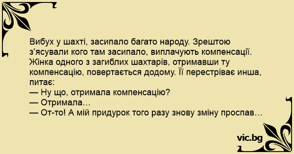 Вибух у шахті, засипало багато народу. Зрештою з’ясували кого там засипало, виплачують компенсації. Жінка одного з загиблих шахтарів, отримавши ту компенсацію, повертається додому. Її перестріває инша, питає: