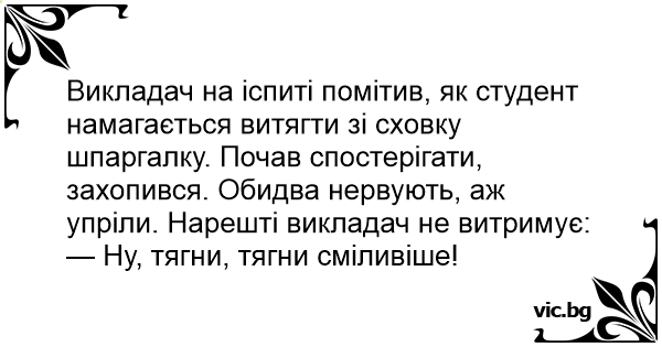 Викладач на іспиті помітив, як студент намагається витягти зі сховку шпаргалку. Почав спостерігати, захопився. Обидва нервують, аж упріли. Нарешті викладач не витримує: