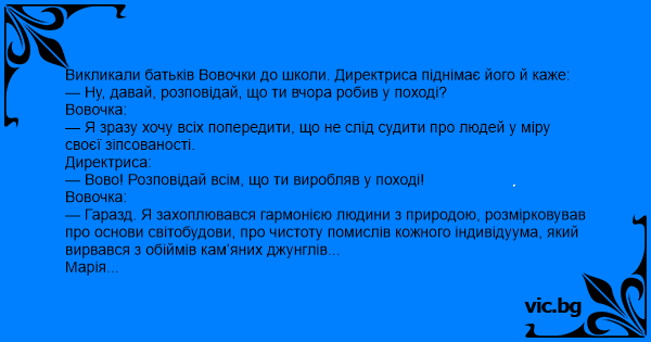 — Вовочко, припини блазнювати! Ти роздивлявся на голих сільських дівчат, які купалися в ставку!