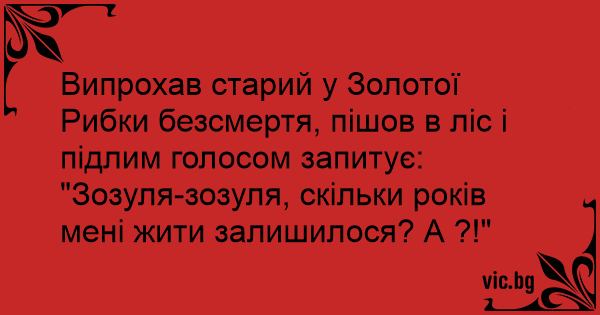 Випрохав старий у Золотої Рибки безсмертя, пішов в ліс і підлим голосом запитує: "Зозуля-зозуля, скільки років мені жити залишилося? А ?!"