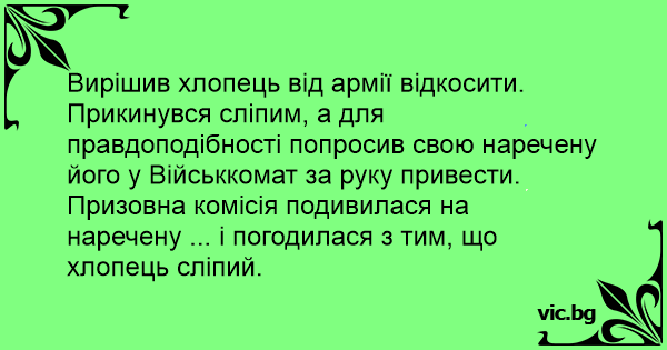 Вирішив хлопець від армії відкосити. Прикинувся сліпим, а для правдоподібності попросив свою наречену його у Військкомат за руку привести. Призовна комісія подивилася на наречену ... і погодилася з тим, що хлопець сліпий.