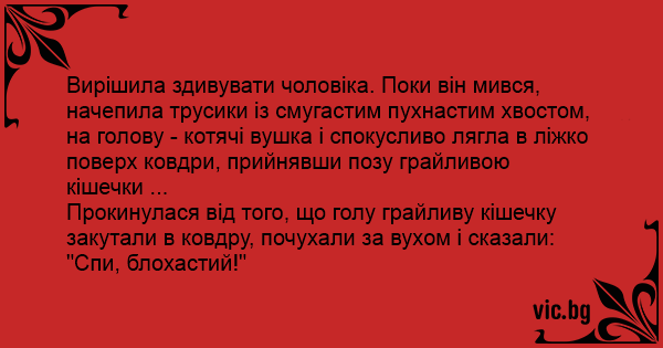 Вирішила здивувати чоловіка. Поки він мився, начепила трусики із смугастим пухнастим хвостом, на голову - котячі вушка і спокусливо лягла в ліжко поверх ковдри, прийнявши позу грайливою кішечки ...