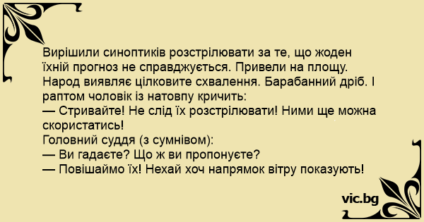 Вирішили синоптиків розстрілювати за те, що жоден їхній прогноз не справджується. Привели на площу. Народ виявляє цілковите схвалення. Барабанний дріб. І раптом чоловік із натовпу кричить: