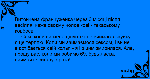 — Сем, коли ви мене цілуєте і не виймаєте жуйку, я це терплю. Коли ми займаємося сексом, і ви не відстібається свій кольт, - я і з цим змирилася. Але, прошу вас, коли ми робимо 69, будь ласка, виймайте сигару з рота!