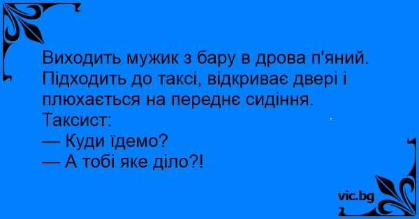 Виходить мужик з бару в дрова п'яний. Підходить до таксі, відкриває двері і плюхається на переднє сидіння.