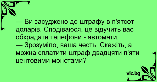 — Зрозуміло, ваша честь. Скажіть, а можна сплатити штраф двадцяти п'яти центовими монетами?