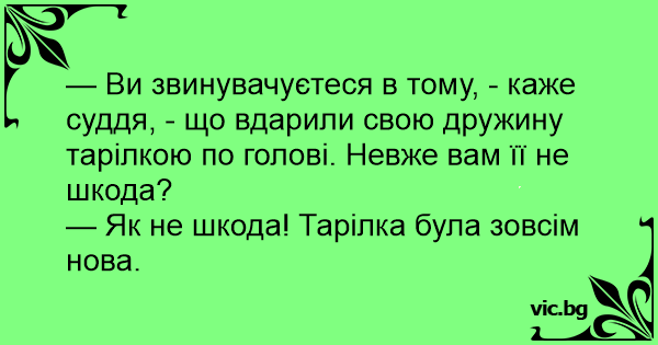 — Ви звинувачуєтеся в тому, - каже суддя, - що вдарили свою дружину тарілкою по голові. Невже вам її не шкода?