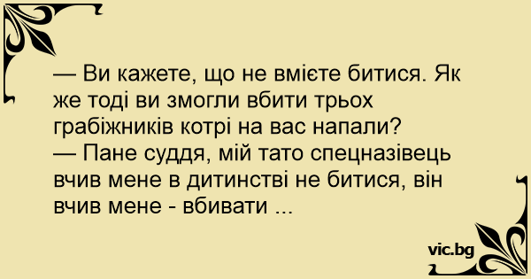 — Пане суддя, мій тато спецназівець вчив мене в дитинстві не битися, він вчив мене - вбивати ...