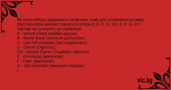 Розміри жіночих грудей, позначаються буквами: Ж - жалюгідний П - природний Д - достойний Г - грандіозний В - велетенський Б - безмежний А - астрономічний