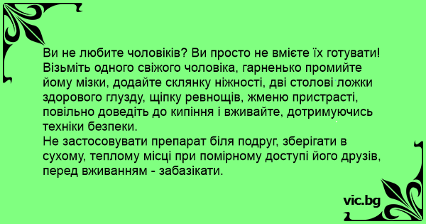 Візьміть одного свіжого чоловіка, гарненько промийте йому мізки, додайте склянку ніжності, дві столові ложки здорового глузду, щіпку ревнощів, жменю пристрасті, повільно доведіть до кипіння і вживайте, дотримуючись техніки безпеки.
