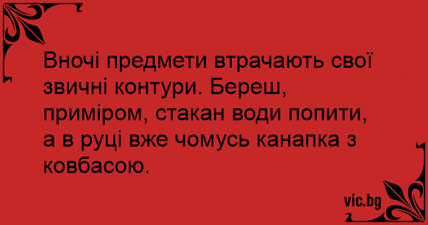 Вночі предмети втрачають свої звичні контури. Береш, приміром, стакан води попити, а в руці вже чомусь канапка з ковбасою.