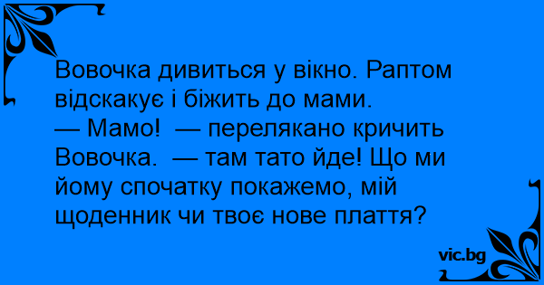 — Мамо! — перелякано кричить Вовочка. — там тато йде! Що ми йому спочатку покажемо, мій щоденник чи твоє нове плаття?