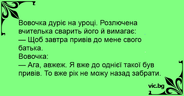 Вовочка дуріє на уроці. Розлючена вчителька сварить його й вимагає: