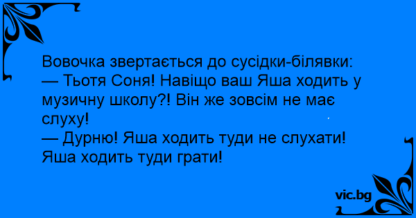 — Тьотя Соня! Навіщо ваш Яша ходить у музичну школу?! Він же зовсім не має слуху!