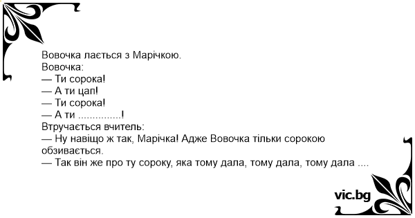 — Ну навіщо ж так, Марічка! Адже Вовочка тільки сорокою обзивається.