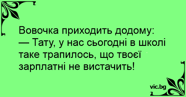 — Тату, у нас сьогодні в школі таке трапилось, що твоєї зарплатні не вистачить!