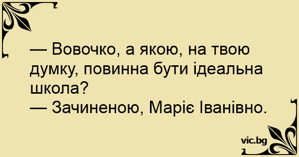 — Вовочко, а якою, на твою думку, повинна бути ідеальна школа?
