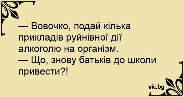 — Вовочко, подай кілька прикладів руйнівної дії алкоголю на організм.