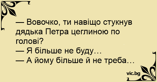 — Вовочко, ти навіщо стукнув дядька Петра цеглиною по голові?
