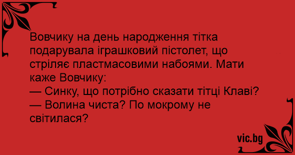 Вовчику на день народження тітка подарувала іграшковий пістолет, що стріляє пластмасовими набоями. Мати каже Вовчику: