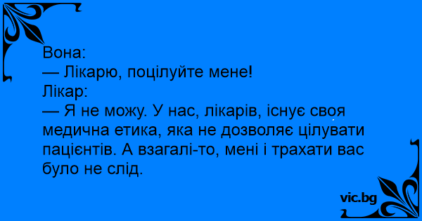 — Я не можу. У нас, лікарів, існує своя медична етика, яка не дозволяє цілувати пацієнтів. А взагалі-то, мені і трахати вас було не слід.