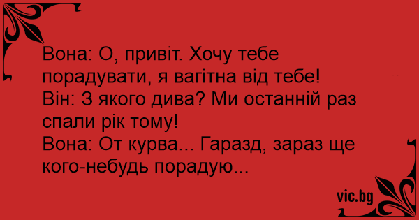 Вона: О, привіт. Хочу тебе порадувати, я вагітна від тебе!